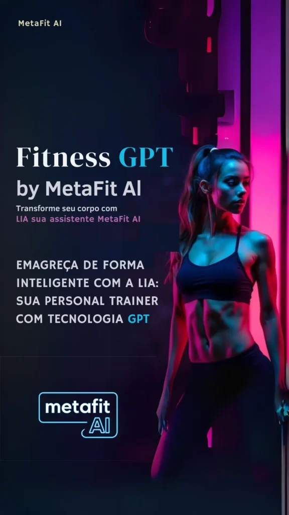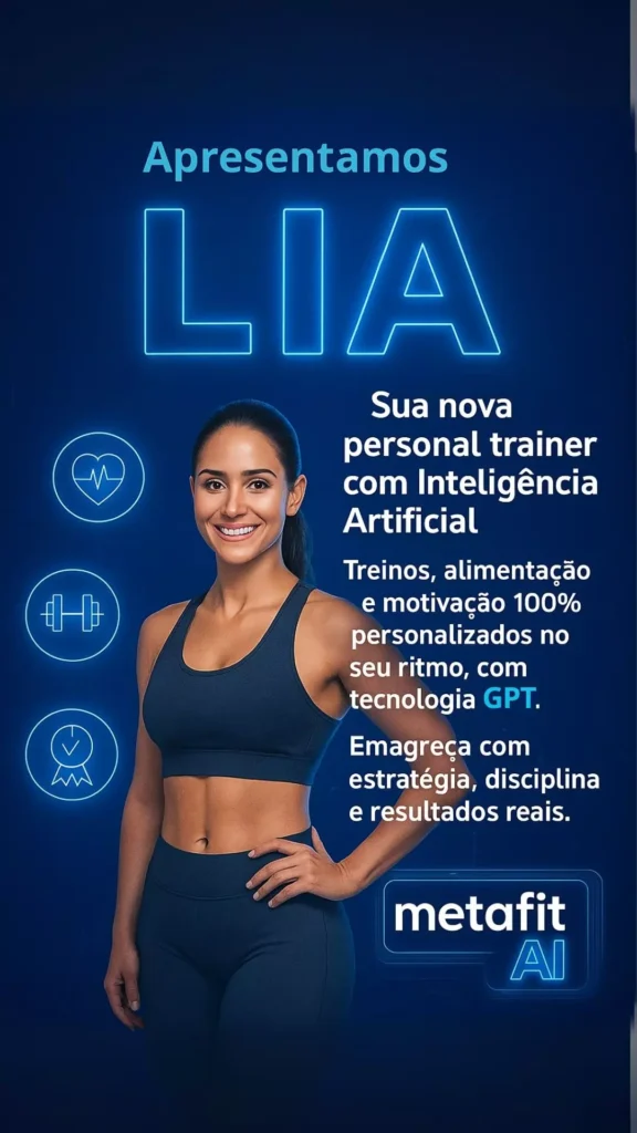 LIA é a sua nova personal trainer com tecnologia GPT, integrada ao aplicativo METAFIT AI — uma inteligência artificial que pensa, calcula, ajusta e guia você rumo ao corpo que deseja, com ciência e estratégia.